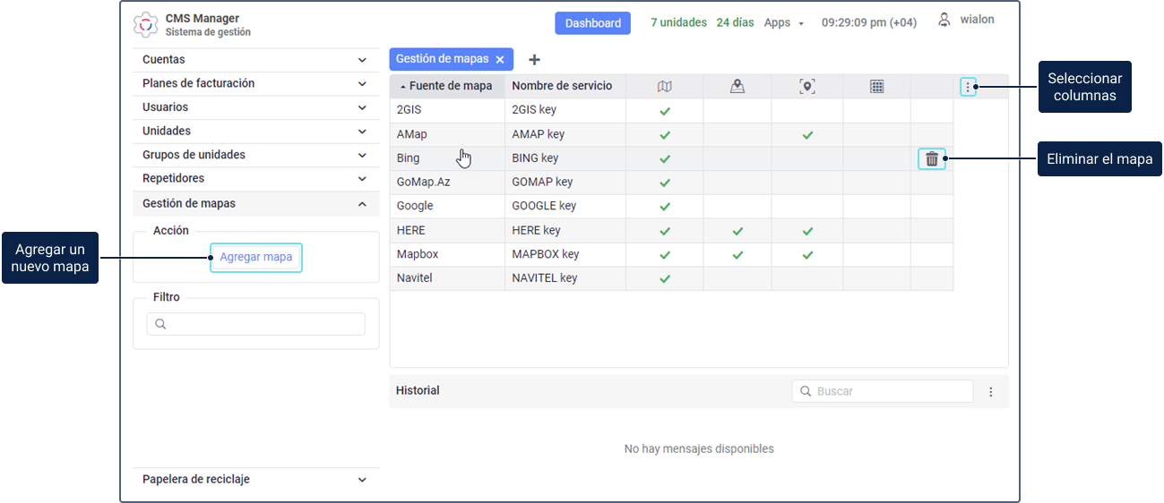 La sección Gestión de mapas está disponible solo en el sistema de gestión CMS Manager para cuentas de nivel superior. En esta sección, puede añadir, modificar y eliminar mapas. La tabla estándar contiene todos los mapas que se pueden utilizar como mapa base, fuente de enrutamiento, fuente de geodatos y de matriz de distancias. En la línea de cada mapa, los servicios disponibles para él están indicados con el icono