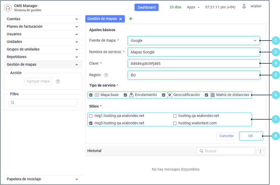 | Servidor de mapa* | El campo está disponible solo si escoge la fuente de mapa Custom map. Aquí tiene que indicar el enlace al servidor del mapa. |