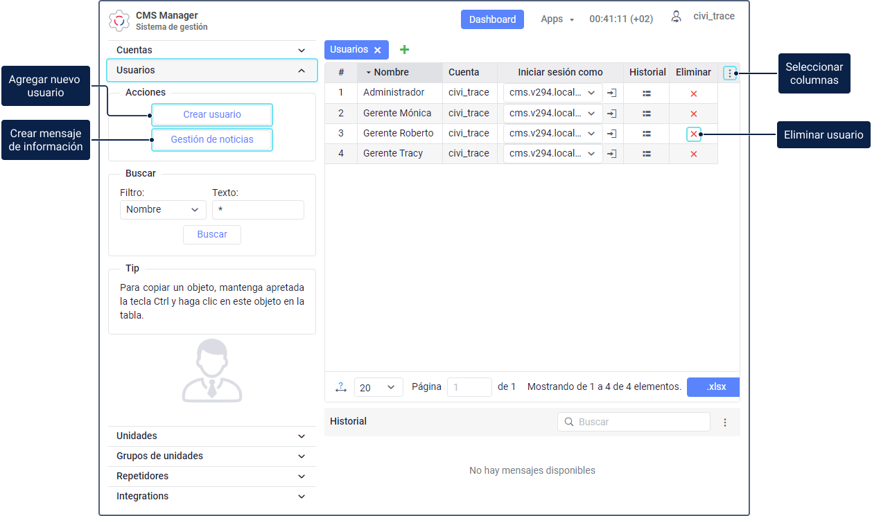 Puede gestionar usuarios en el sistema de rastreo (pestaña Usuarios) y en el sistema de gestión (sección Usuarios).