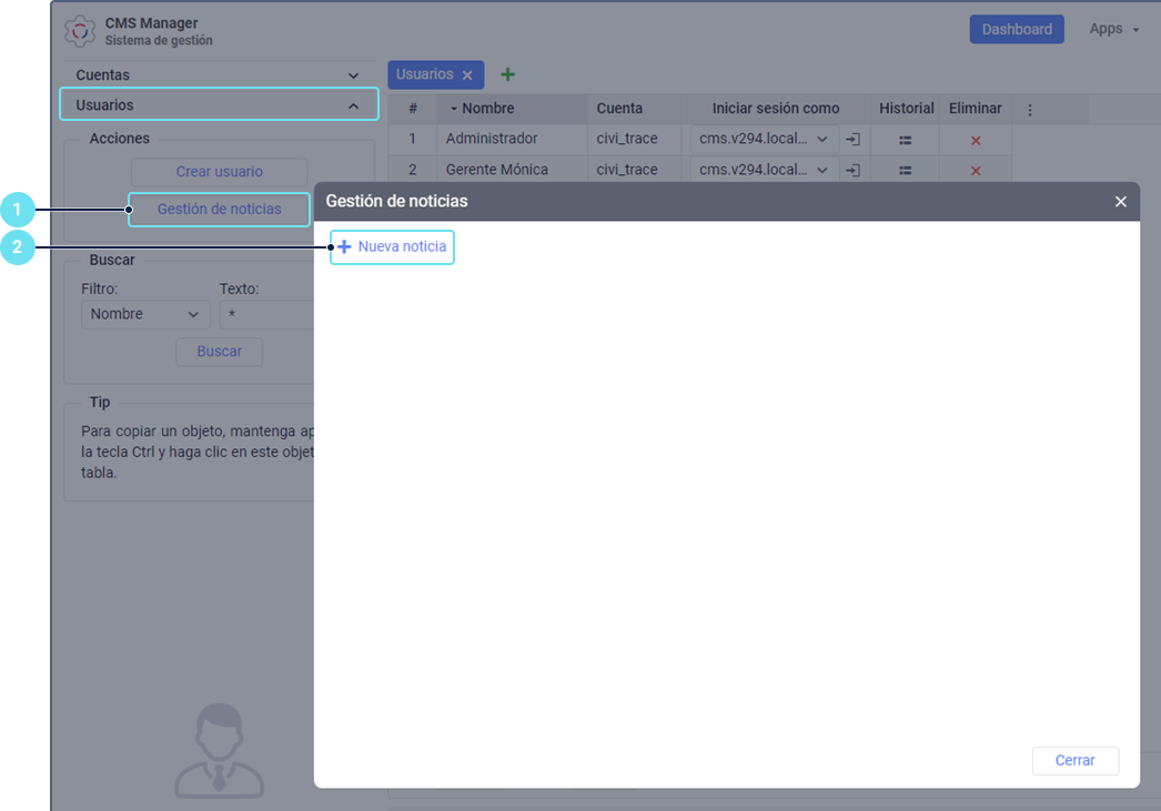En la sección Usuarios, haga clic en el botón Gestión de noticias.