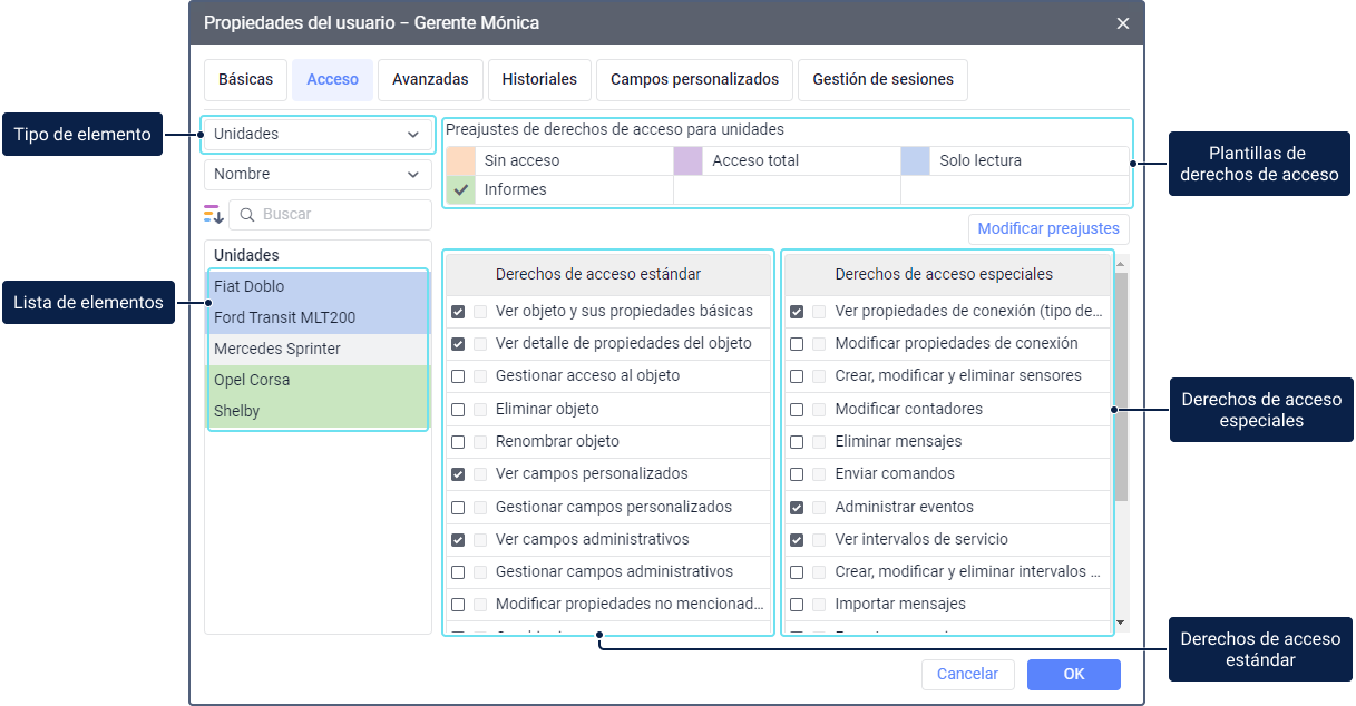 En la parte derecha se muestran los derechos de acceso a los objetos que pueden ser concedidos al usuario. Los derechos están divididos en dos tipos: estándar y especiales (que dependen del tipo escogido de objetos, por ejemplo, derechos a unidades).