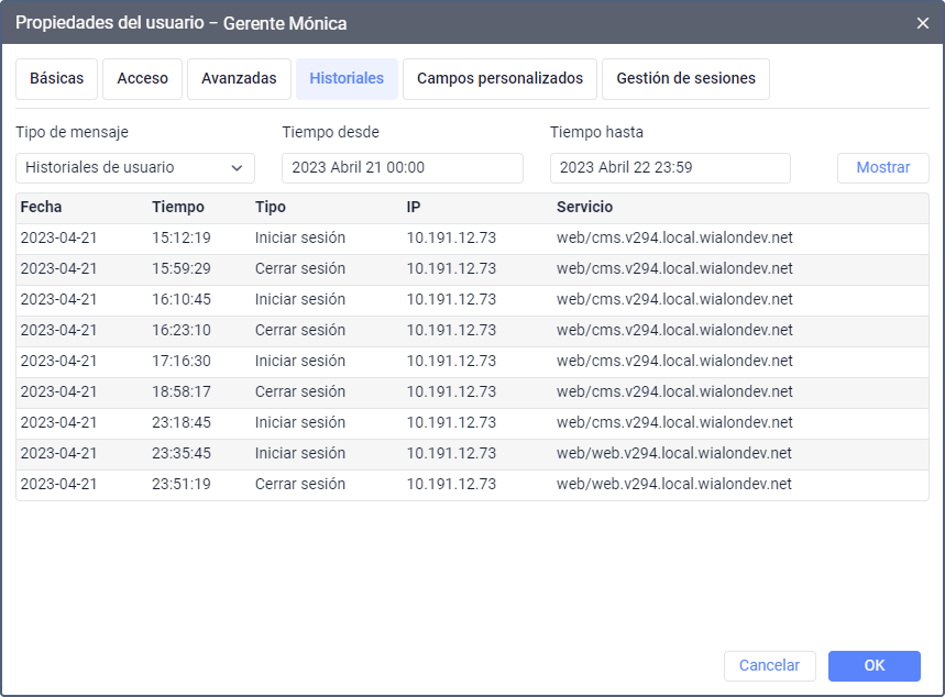 Esta pestaña contiene una tabla en la que puede ver cuántas veces el usuario ha iniciado o ha finalizado sesión en el sistema. Para obtener datos de un período determinado, escójalo en el calendario y apriete Mostrar.