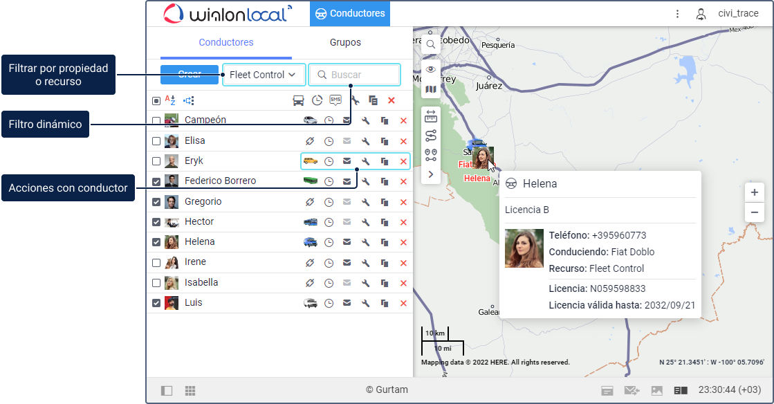 Para que un conductor se muestre en el mapa, márquelo en la lista. Previamente, asegúrese de que la capa de conductores está activada.