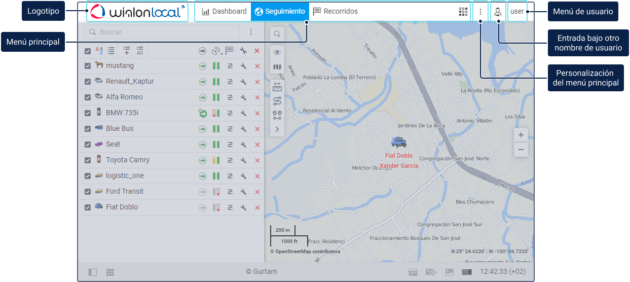 En la barra de herramientas superior a la izquierda se sitúa el logo del proveedor del servicio de rastreo; a la derecha, el botón de la configuración del menú y el nombre del usuario con el cual se ha iniciado la sesión.