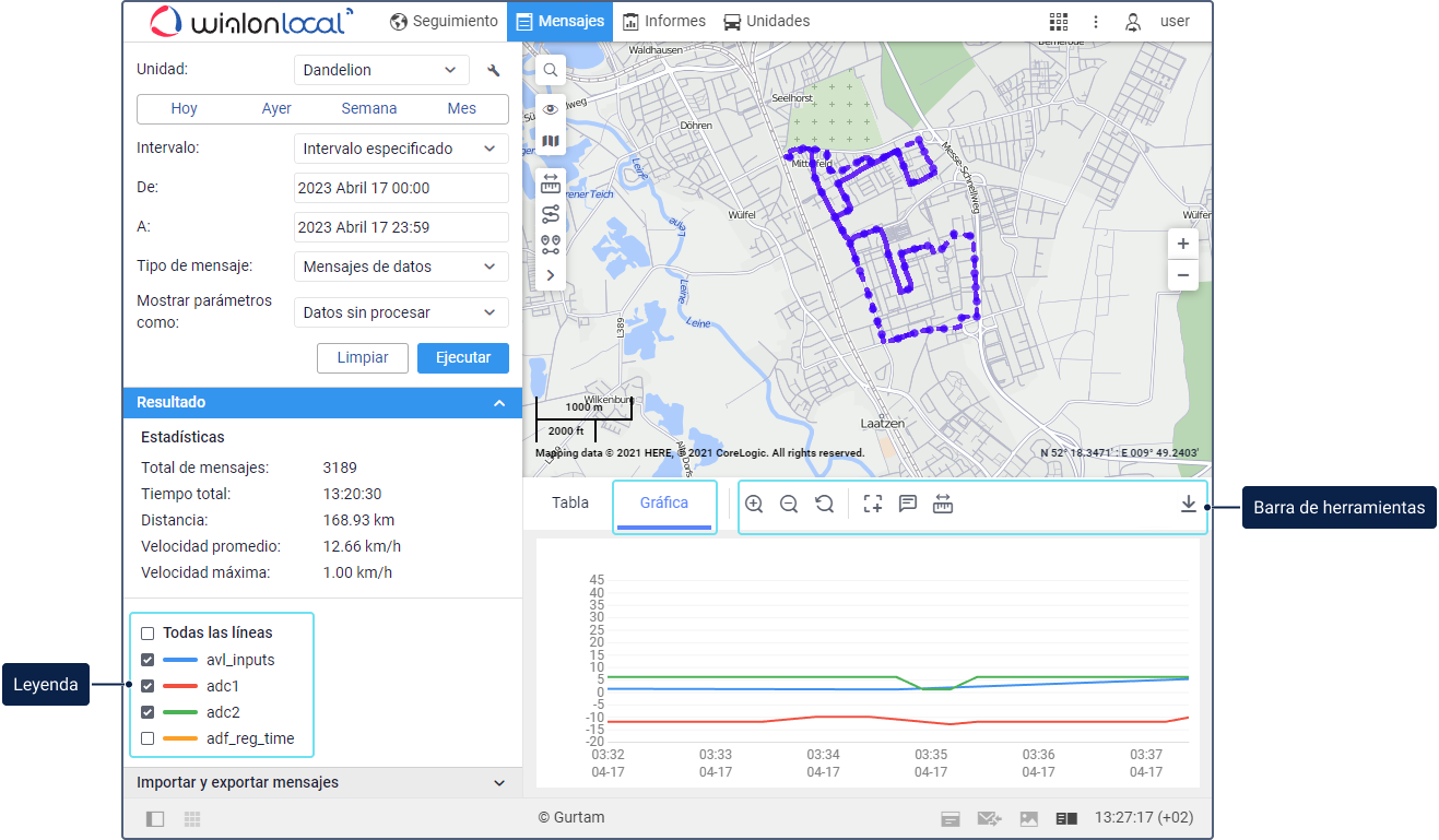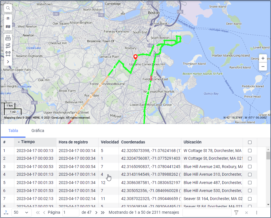 Después de solicitar mensajes se puede ver el recorrido de la unidad en el mapa.