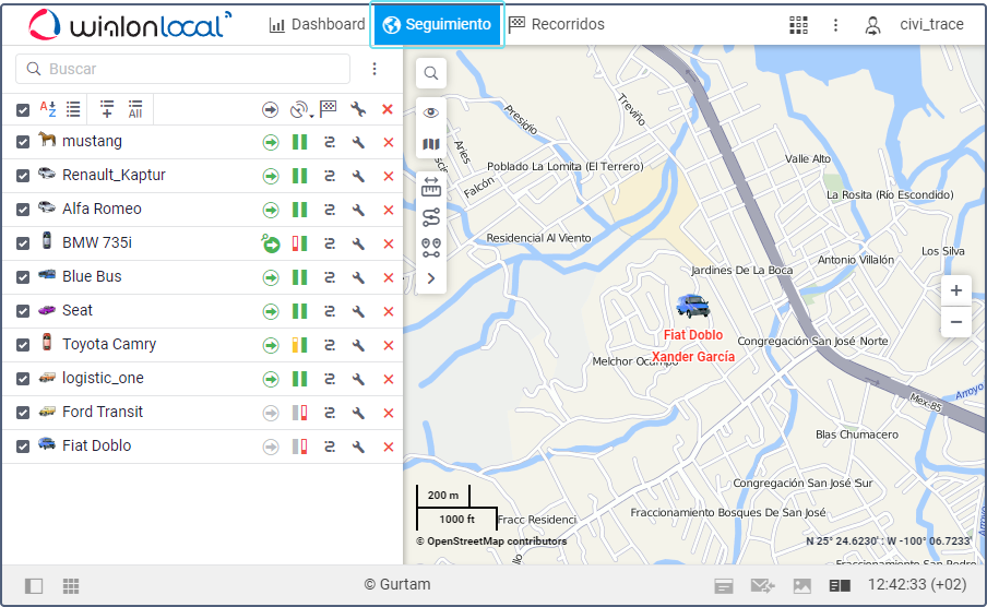 En la pestaña Seguimiento están disponibles las principales funciones de rastreo satelital. Aquí puede ver el movimiento de las unidades en el mapa, enviarles comandos y mensajes, solicitar fotos y vídeos, seguir los cambios de parámetros en línea, etc.