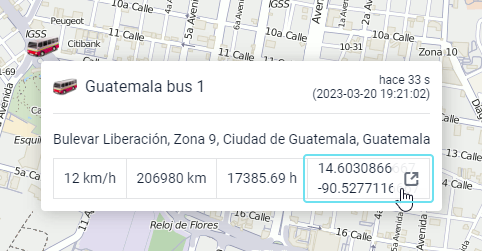 Una vez hecho clic en una unidad en el mapa, se abre un menú encima de la unidad. Contiene los mismos iconos y botones que se han elegido para el área de trabajo del Panel de seguimiento. Además, independientemente de los iconos/botones elegidos, en este menú siempre habrá botones para generar un informe rápido y para construir un recorrido rápido.