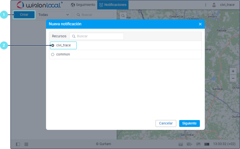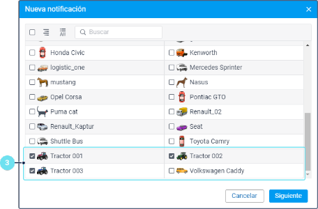 - Escoja la unidad o unidades para las que quiere crear la notificación. El procedimiento de elección de unidades es el mismo que se emplea al crear una tarea.