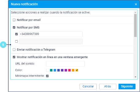 - Establezca los parámetros que dependen del tipo de notificación escogido y se describen detalladamente en la página Tipos de notificaciones.