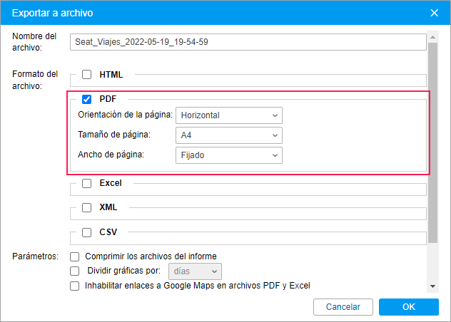 - Seleccione el formato del archivo en el que quiere guardar el informe. Al seleccionar varios formatos, obtendrá el mismo informe guardado como varios archivos en formatos seleccionados. Los formatos PDF y CSV tienen algunos ajustes adicionales (vea la sección Formatos de archivos).