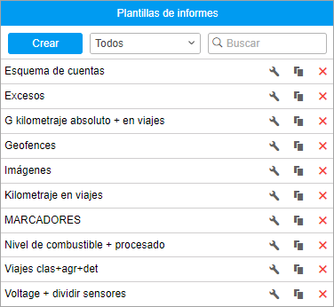 Un informe puede generarse solo a base de una plantilla creada de antemano. La lista de todas las plantillas disponibles está en la parte izquierda inferior en la pestaña Informes. Aquí se puede crear, modificar, copiar y eliminar plantillas de informes.
