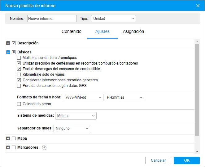 En la sección Básicos de los ajustes del informe se puede configurar el formato de fecha y hora, elegir el sistema de medidas y el separador de miles, así como activar algunas otras opciones cuya disponibilidad depende del tipo de informe.