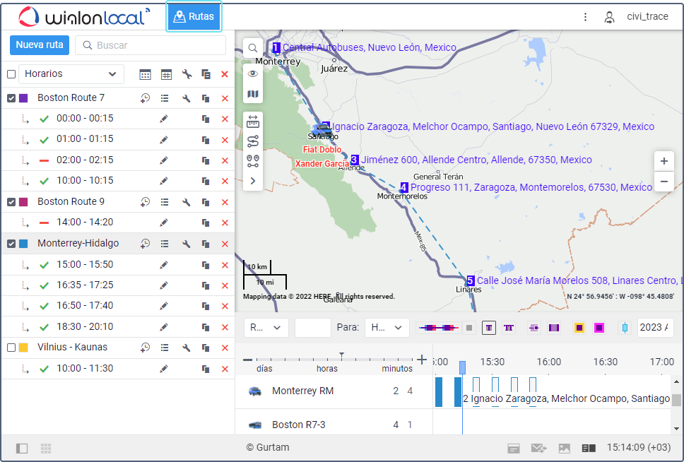 En esta pestaña puede crear rutas de movimiento de unidades, seguir la realización de rutinas, comprobar su estado, etc. Las rutas consisten de puntos de control a los que deben llegar unidades en un orden determinado o arbitrario según el horario o sin él. En la pestaña, puede emplear la búsqueda dinámica por nombre de ruta.