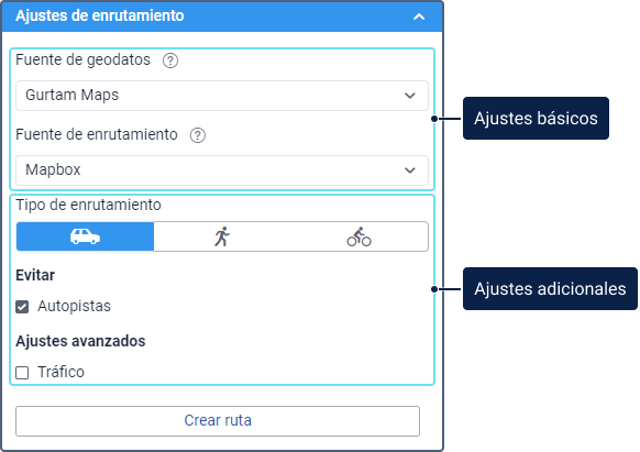 Esta sección consiste de ajustes básicos y adicionales que permiten planificar rutas teniendo en cuenta las siguientes particularidades: