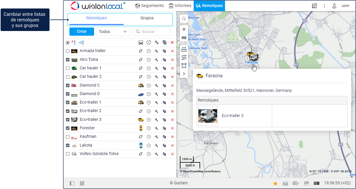 Para gestionar remolques, haga clic en la pestaña Remolques en la barra de herramientas superior o escoja el punto del mismo nombre en el personalizador del menú principal. Puede gestionar tanto remolques como sus grupos.