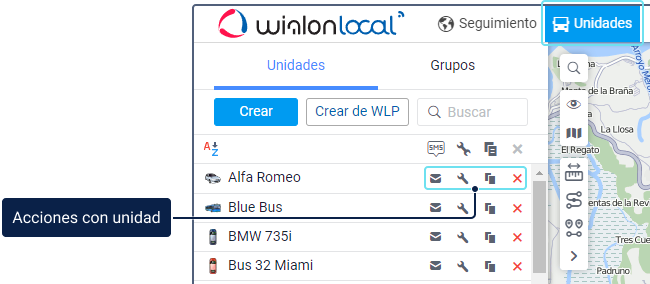 Al lado del nombre de la unidad se encuentran los iconos con los que puede realizar las siguientes acciones: