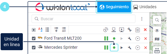 Pase a la pestaña Seguimiento donde se agregan automáticamente las unidades creadas. Asegúrese de que la unidad está conectada y envía mensajes al sistema. Si es así, un marcador verde se muestra para la unidad en la lista en la columna Estado de conexión.