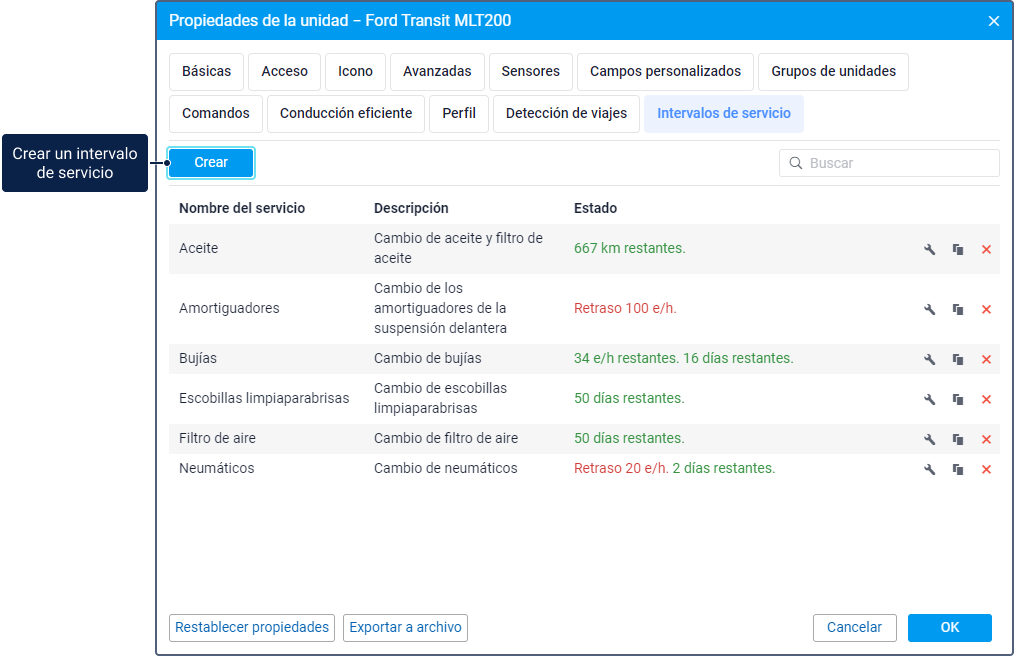 En la lista de intervalos, se muestra el nombre de cada servicio, su descripción (si hay) y el estado de ejecución. En la columna Estado, puede ver cuántos kilómetros, horas o días quedan antes del inicio del servicio. Si el servicio está retrasado, la información de su estado se resalta en rojo.