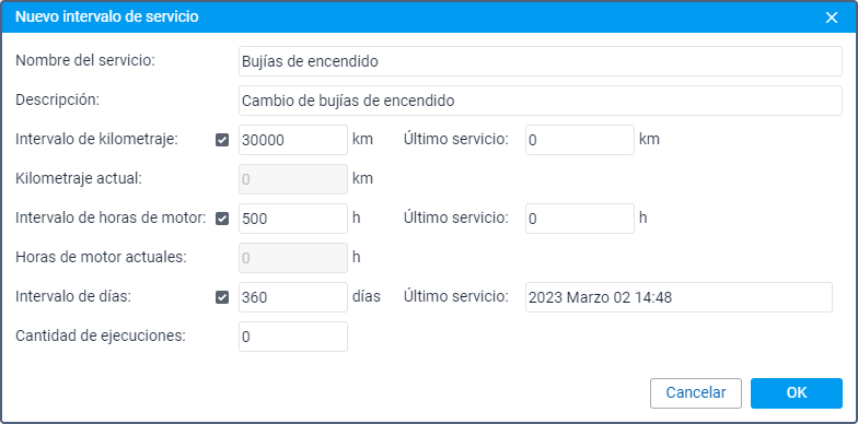 | Intervalo de días | Active esta opción e indique cada cuántos días debe realizarse el servicio. En el campo Último servicio, indique la fecha en que se realizó el último servicio. |