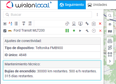 Los intervalos de servicio creados pueden mostrarse en la descripción emergente de la unidad y en la información ampliada de la unidad en la pestaña Seguimiento.