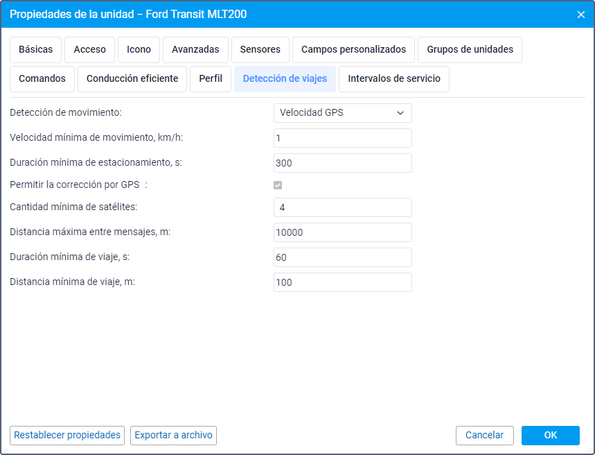 Los parámetros de detección de viajes se utilizan para determinar intervalos de movimiento, viajes, paradas y estacionamientos.