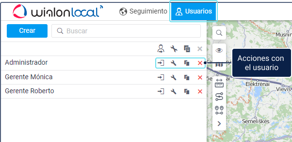 En el sistema de rastreo se puede gestionar usuarios en la pestaña principal, así como emplearlos al realizar las siguientes acciones: crear nuevos objetos en el sistema, conceder derechos de acceso, ejecutar informes, etc.