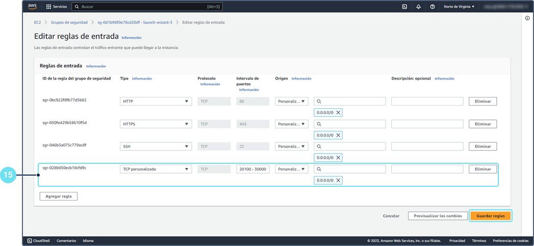 Modifique las reglas de entrada. Añada la regla con los puertos de 20 100 a 30 000 para los dispositivos.