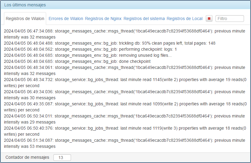 También se puede ajustar la cantidad de líneas que se muestran en el registro. Para hacerlo, introduzca el número necesario en el campo Contador de mensajes situado abajo (equivale a la utilidad tail).