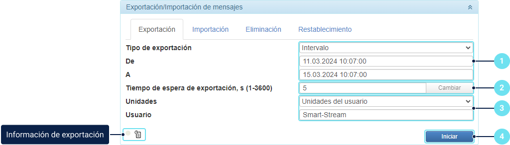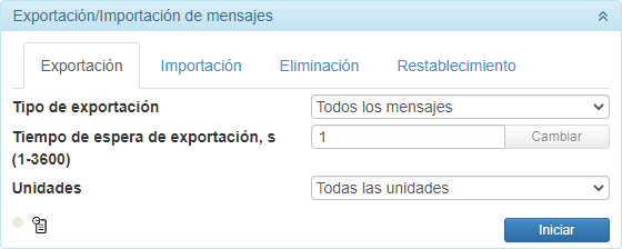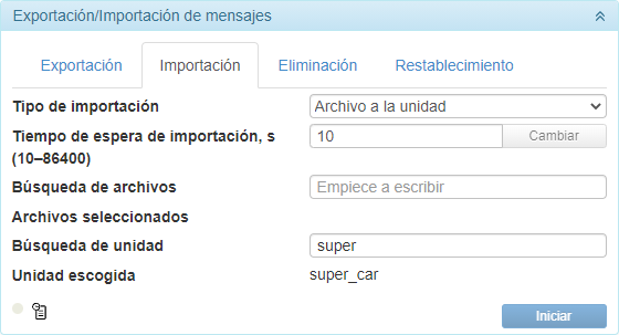 Igual que para la exportación, se puede especificar la duración de la pausa entre la importación de mensajes de diferentes unidades en el campo Tiempo de espera de importación.