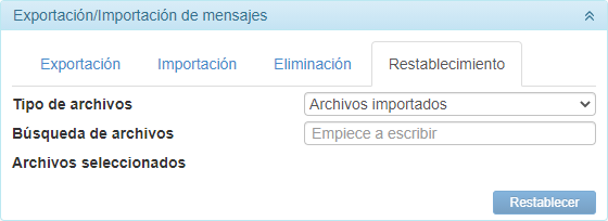 En esta pestaña, se puede recuperar los archivos importados anteriormente y los archivos al importar los cuales se ha producido un error. Como resultado de restablecimiento, los archivos se transfieren de los directorios /home/wialon/wlocal**/tmp/exp_imp_dir/imported_files/** y /home/wialon/wlocal**/tmp/exp_imp_dir/import_failure** al directorio /home/wialon/wlocal**/tmp/exp_imp_dir**. Después de hacerlo, se puede volver a importar estos archivos.