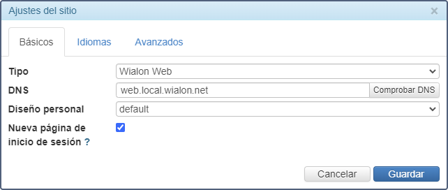 | DNS | En este campo se indica el nombre de dominio del sitio. Puede asegurarse de que el sitio está disponible al apretar el botón Comprobar DNS. |