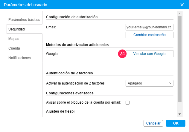 Inicie la sesión en el sitio de rastreo utilizando el nombre de usuario para el que quiere configurar la autorización con Google. En los parámetros del usuario, pestaña Seguridad, haga clic en Vincular con Google.