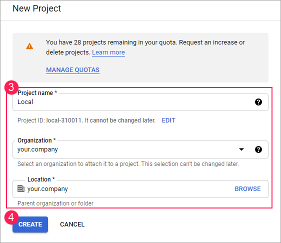 Escriba el nombre de proyecto (Project name), nombre de empresa (Organization) y ubicación del proyecto (Location). Si utiliza una cuenta personal, el campo Organization no se muestra.
