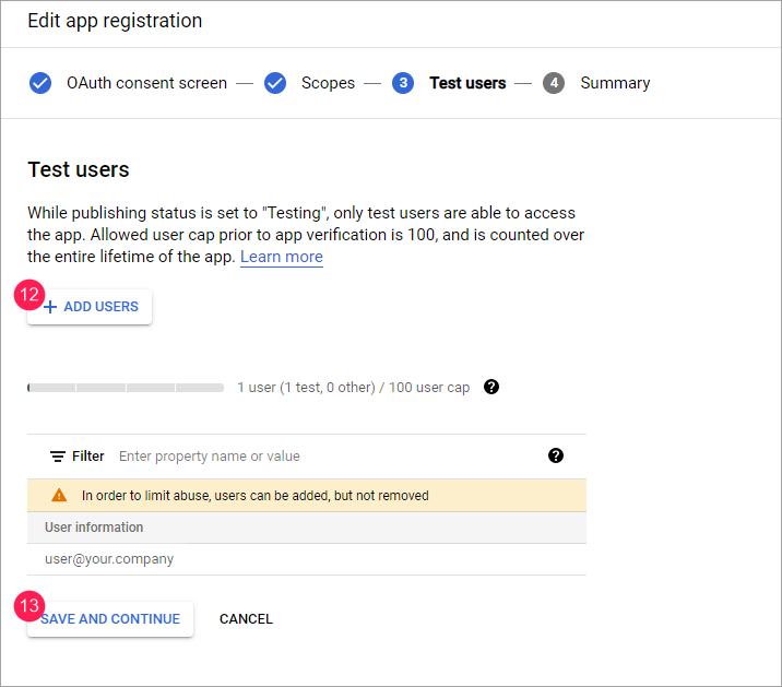 Si es necesario, configure ámbitos (scopes) y haga clic en Save and Continue.