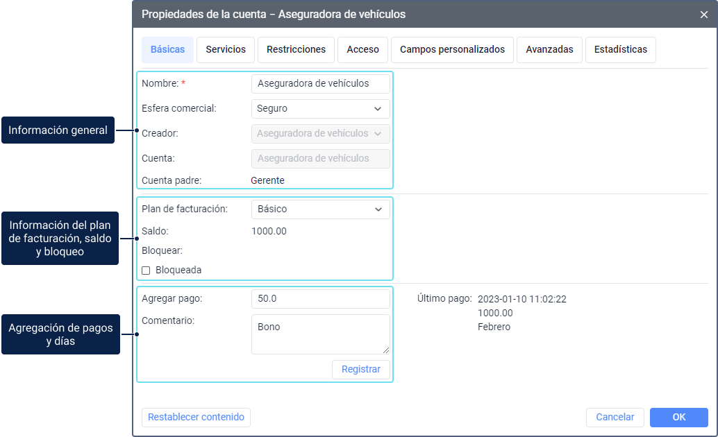 - Gestionar cuenta, para cambiar el plan de facturación, bloquear y desbloquear la cuenta, agregar pagos y días, así como para ver y modificar el campo Esfera comercial.