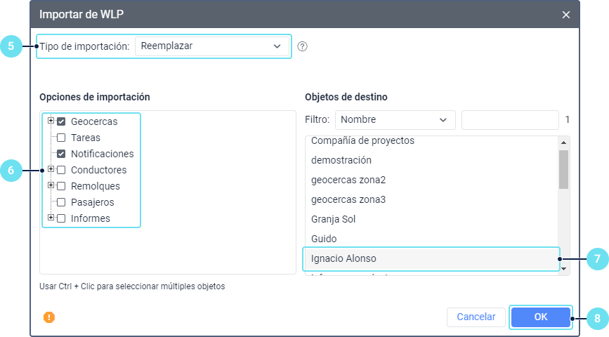 En la ventana Importar de WLP que se ha abierto (al restablecer el contenido, se aplica el mismo mecanismo que en la importación del archivo WLP) escoja el tipo de importación.