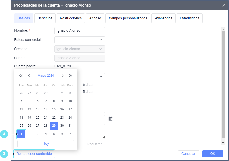 La función de restablecimiento del contenido (botón Restablecer contenido) está disponible en las propiedades: