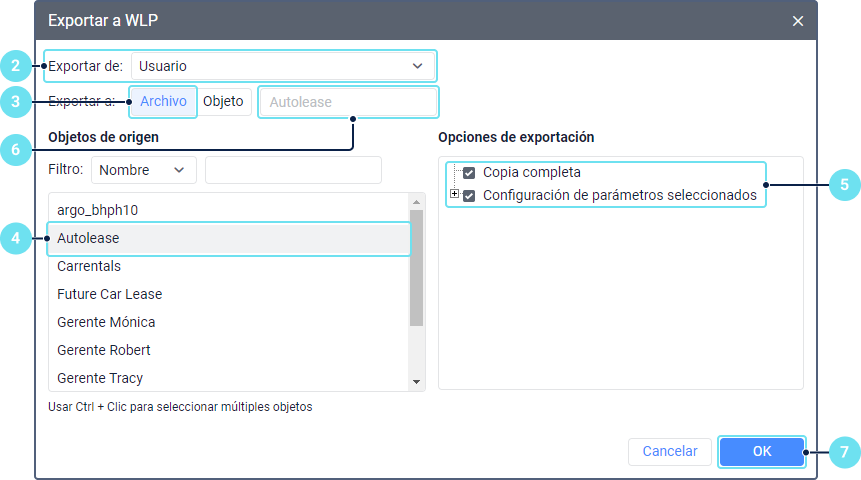En la sección Opciones de exportación, seleccione propiedades, ajustes u objetos específicos que quiere copiar. Para seleccionar todas las líneas, mantenga presionada la tecla Ctrl y haga clic en cualquier línea.