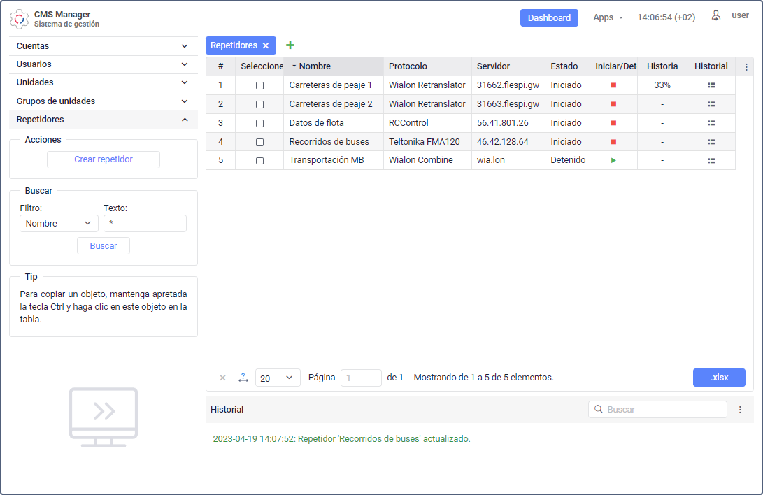 Los repetidores permiten transmitir mensajes de unidades de su servidor a otros servidores o sistemas en tiempo real o por el período anterior. Por medio de los repetidores, se puede transmitir datos a varios servidores simultáneamente utilizando diferentes protocolos.