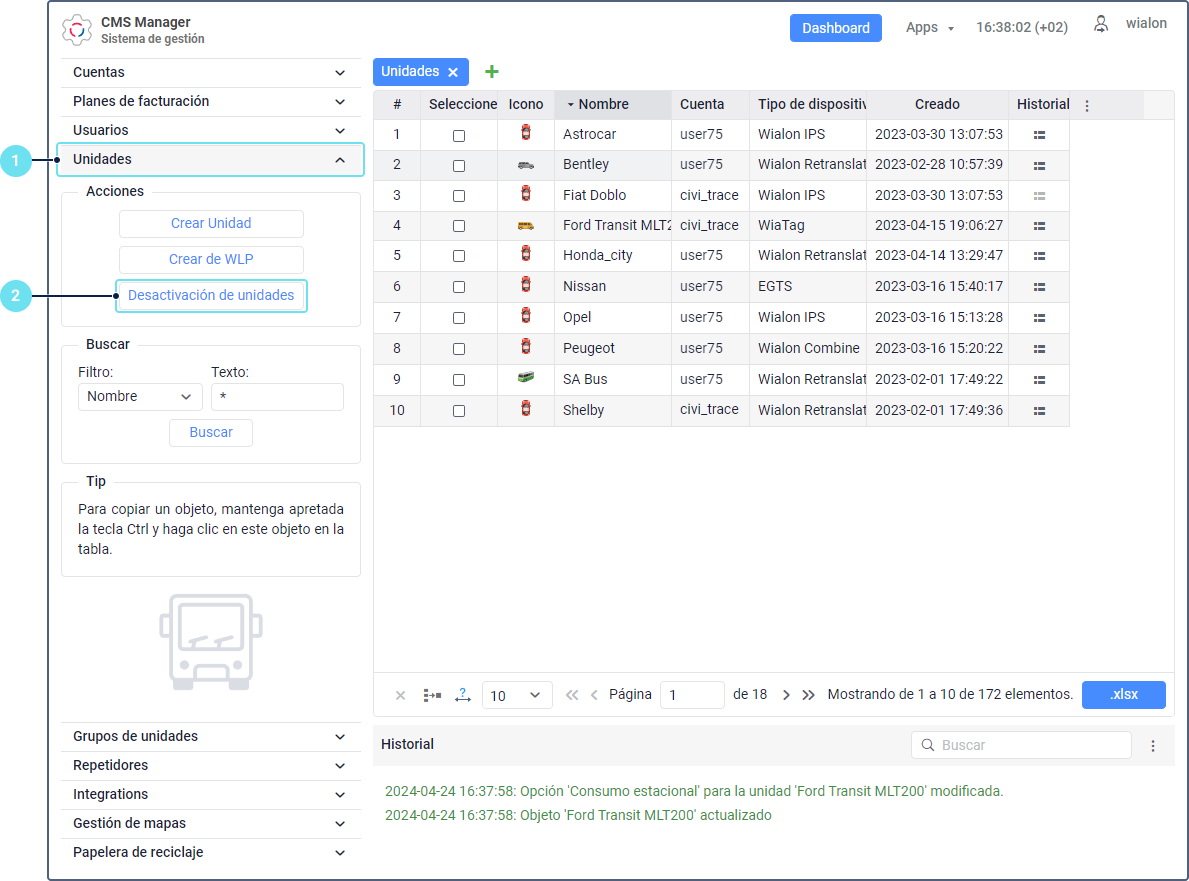 o un doble clic en la unidad. Una vez alcanzado el límite, no puede mover las unidades a la lista derecha. En este caso en el historial se muestra un mensaje con los nombres de las unidades que no se han conseguido desactivar. -