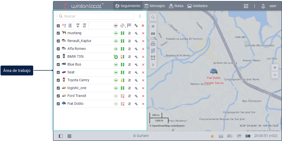 En el área de trabajo, se puede realizar diferentes acciones con los objetos del sistema. El contenido del área depende de la pestaña seleccionada en el menú principal.