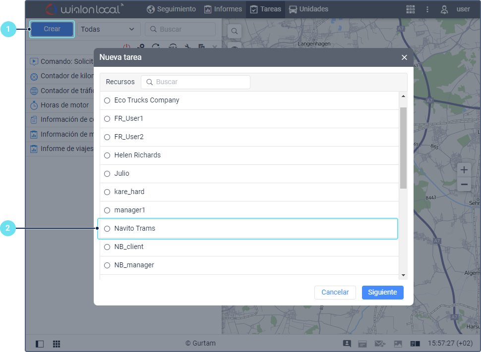 5. Seleccione una o varias unidades para las que quiere crear la tarea. Para la tarea Enviar un informe por email, se puede escoger otros objetos (usuarios, recursos, etc.) en función del tipo del informe.