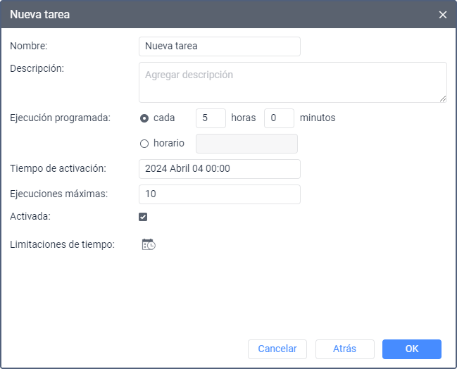 En este caso, la tarea se ejecutará a las 8 de la mañana y a las 10 de la noche los días indicados en el parámetro Limitaciones de tiempo o todos los días si no hay limitación establecida.