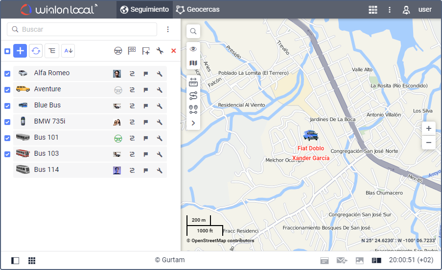 En la pestaña Seguimiento están disponibles las principales funciones de rastreo satelital. Aquí puede ver el movimiento de las unidades en el mapa, enviarles comandos y mensajes, solicitar fotos y vídeos, seguir los cambios de parámetros en línea, etc.