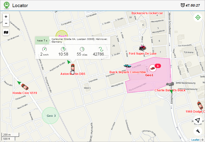 Una vez seguido el enlace cuya hora de activación ya ha llegado, se abre el mapa del localizador con las unidades y geocercas trazadas (si se han indicado al crear el enlace). Las unidades en el localizador se muestran en los mapas Gurtam Maps y Google (si hay). La elección del mapa base se realiza por medio de apretar el icono