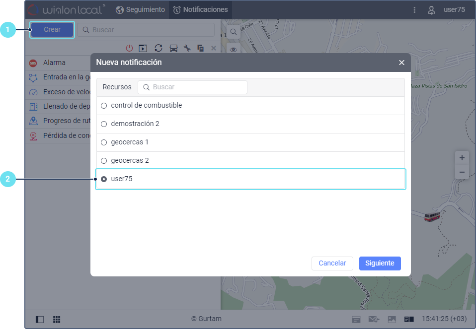 - Escoja la unidad o unidades para las que quiere crear la notificación. El procedimiento de elección de unidades es el mismo que se emplea al crear una tarea.