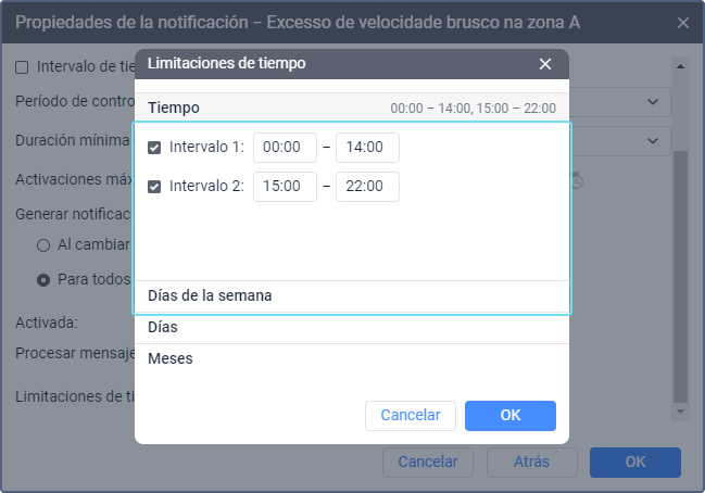 Indique en qué horas del día deben controlarse los parámetros de la notificación. Se puede indicar dos intervalos. Para que los campos de intervalos se activen, coloque una marcas al lado de ellos.
