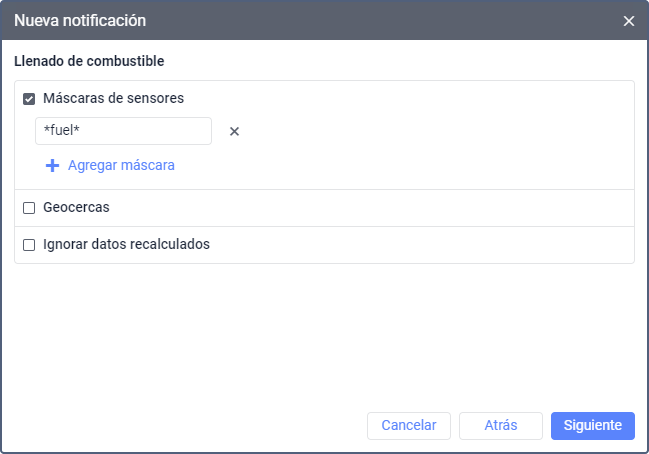 Si la opción Ignorar datos recalculados está activada, la notificación se envía solo una vez después de detectarse el llenado de combustible.