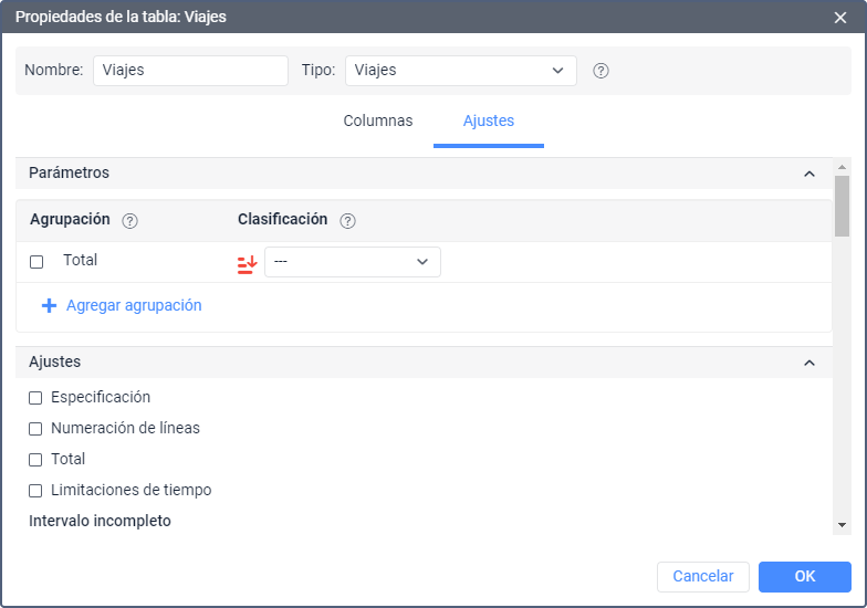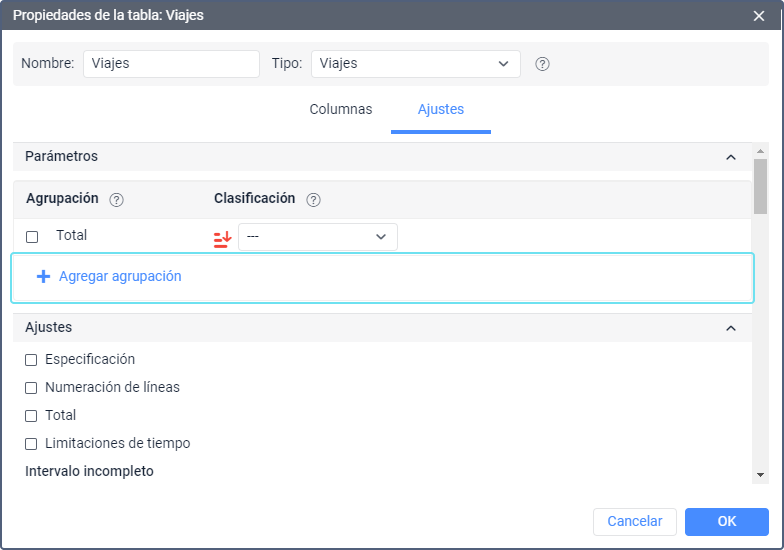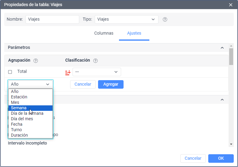 De los intervalos temporales disponibles (año, mes, semana, día de la semana, día del mes, estación, fecha, turno) se escogen los intervalos, según los cuales hay que agrupar los datos de la tabla. La agrupación puede ser tanto de un nivel, como de varios. Si es de varios niveles, es decir, si hay unas agrupaciones por diferentes intervalos, hay que configurar su jerarquía. Por ejemplo, una agrupación puede ser así: los datos tabulares están unidos por años, dentro de cada año — por meses y dentro de los meses — por días. La jerarquización se ajusta por medio de arrastrar los intervalos de la columna Agrupación hacia arriba o abajo — el elemento que está más arriba en la lista incluirá los de abajo.
