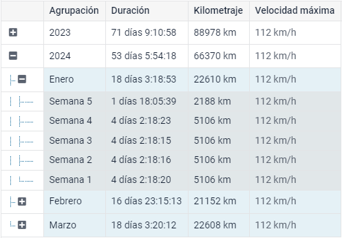 Comparando con la tabla que no tiene ajustados los criterios de agrupación y clasificación, esta tiene dos columnas adicionales. La primera es la columna con los botones «+» y «-» que permiten desplegar/plegar los niveles más bajos. La segunda es la columna Agrupación donde se muestran los niveles mismos. La información de la tabla está agrupada por años y por un clic en «+» se abren los siguientes niveles de agrupación (meses, fechas). Los datos están agrupados por la velocidad máxima (de la mayor a la menor).